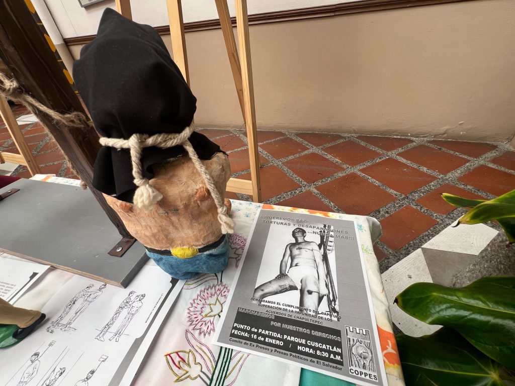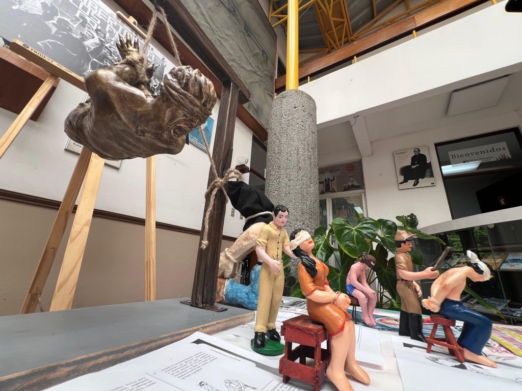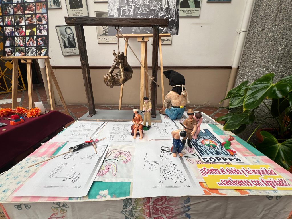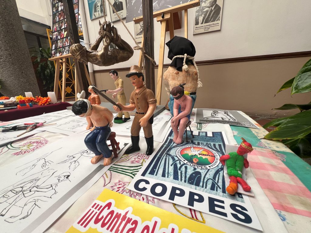El altar COPPES se alza como un recordatorio silencioso y estremecedor. Sobre una base de madera se observan figuras esculpidas grandes y pequeñas, algunas frágiles, pero en su construcción cargan la memoria de un pasado doloroso. Cada una representa un método de tortura utilizado durante el conflicto armado: cuerpos suspendidos en el aire, rostros cubiertos, manos y pies amarrados. El altar no se limita a mostrar el sufrimiento; también narra la resistencia de quienes sobrevivieron y guardan estos recuerdos como parte de su identidad.