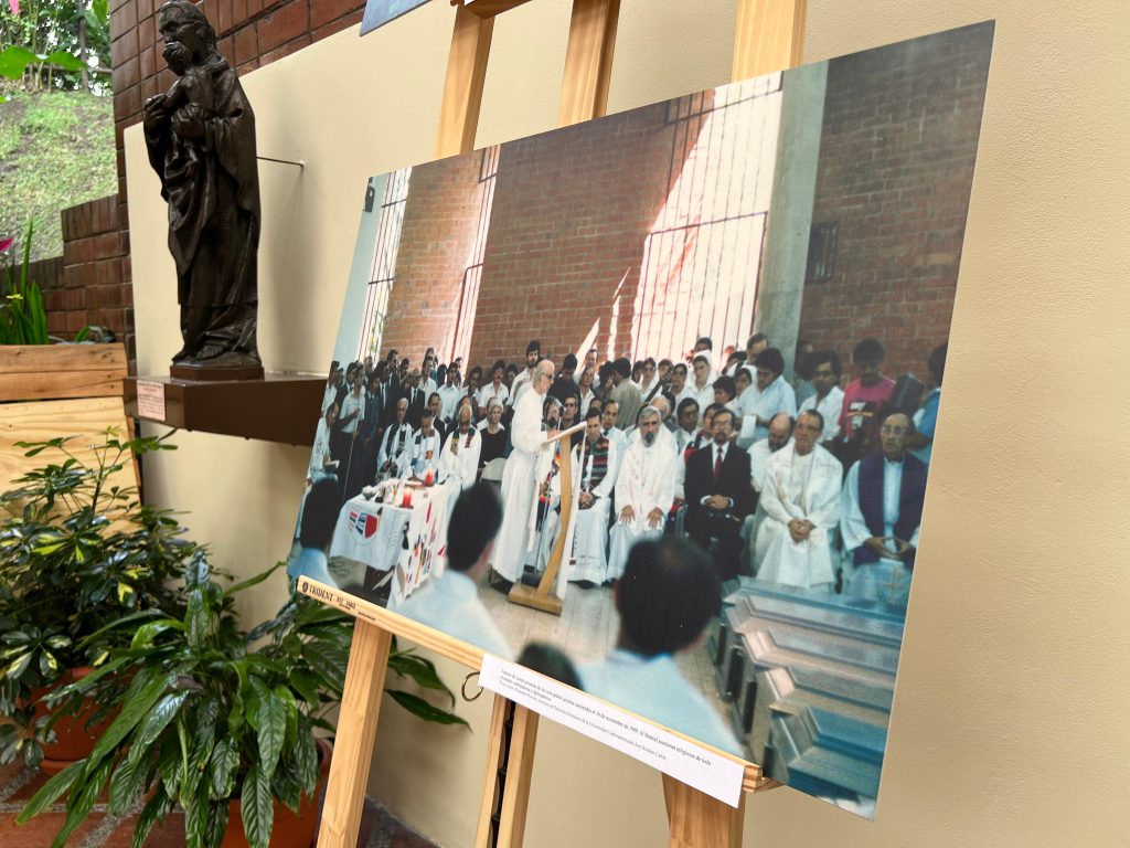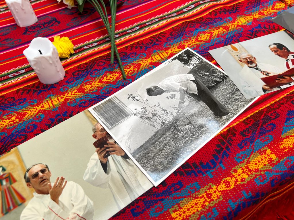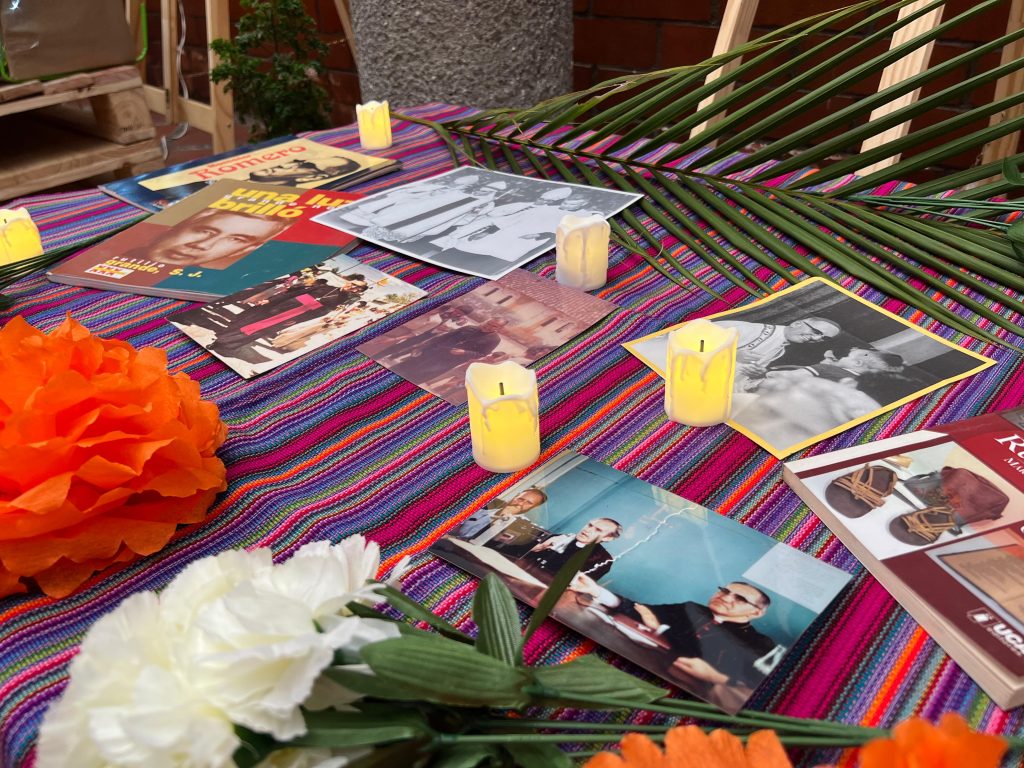 Fotografías simbólicas de quienes fueron seis sacerdotes jesuitas y dos colaboradoras de la Universidad Centroamericana José Simeón Cañas, están colocadas sobre una base de madera alrededor de rosas de papel, velas y la palma del martirio, pareciera como si aún estuvieran reunidos, compartiendo su misión y su espíritu incansable por la educación, la verdad y la justicia del pueblo salvadoreño.