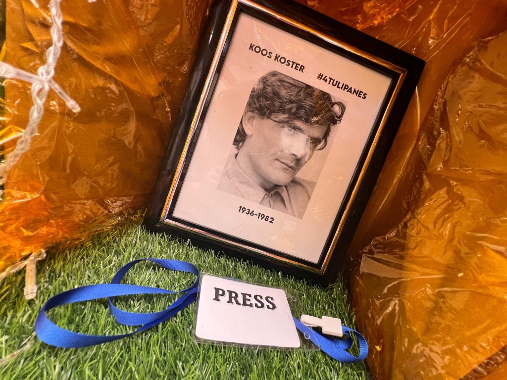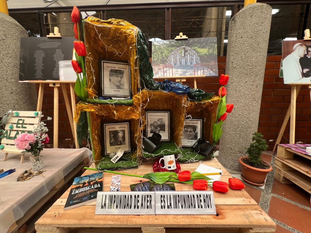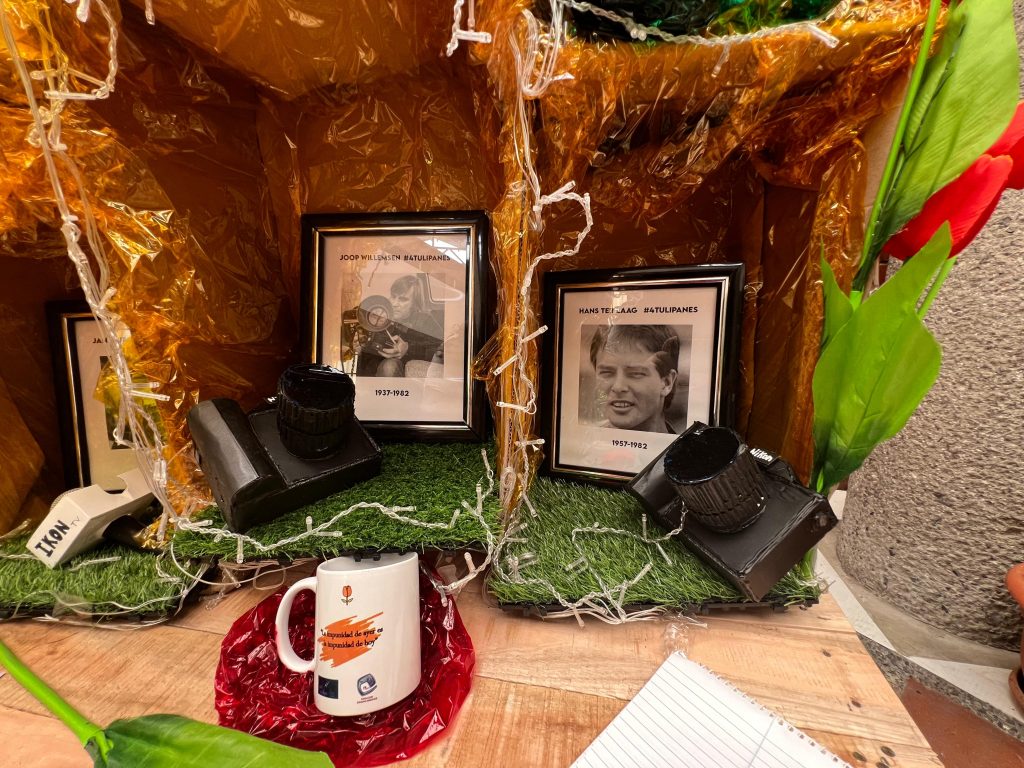 Al pie del altar se lee la frase: “La impunidad de ayer es la impunidad de hoy”. Rodeadas de cámaras, micrófonos, papel y lápiz se encuentran las fotografías de Koos Koster, Hans ter Laag, Jan Kuiper y Joop Willemsem, cuatro periodistas holandeses que fueron emboscados y asesinados por una patrulla del Batallón Atonal en Santa Rita, Chalatenango, en 1982. Un espacio que conmemora a todos aquellos periodistas que dieron su vida por defender el derecho al acceso a la información y la libertad de prensa en un contexto de guerra.