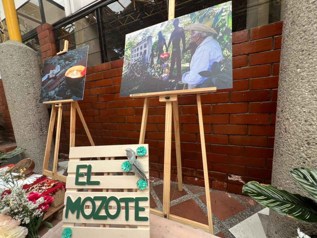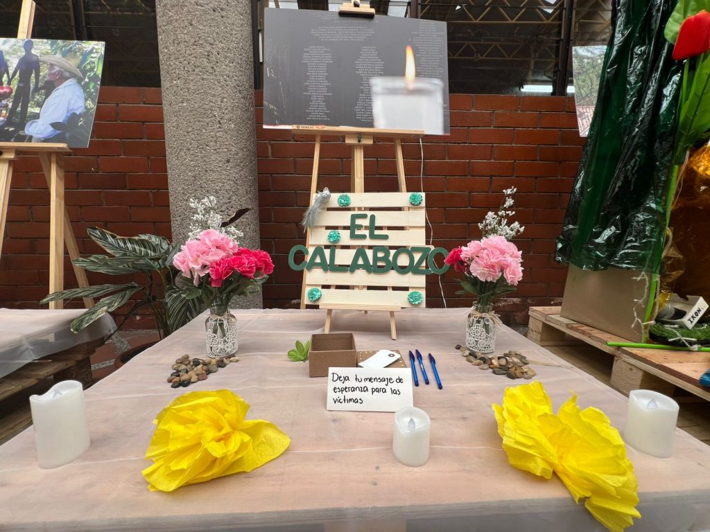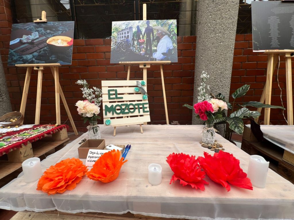 El altar en homenaje a las víctimas de las masacres de El Calabozo y El Mozote es un espacio de duelo y de esperanza, donde la memoria de aquellos que perdieron la vida prevalece como un motivo para continuar luchando por la justicia. Al centro del altar se observa una caja acompañada de papeles y lapiceros, donde quienes se acercan pueden escribirles un mensaje de esperanza a las víctimas.