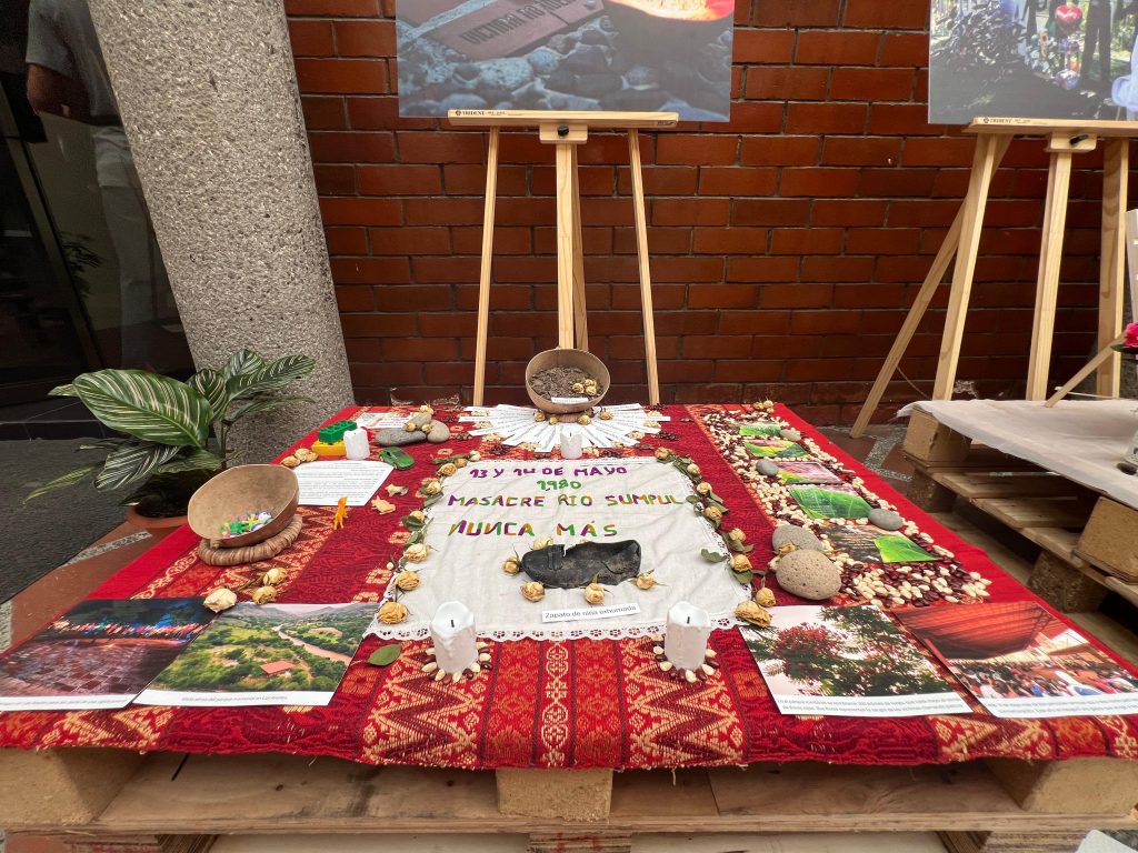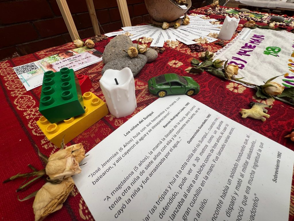 El altar en homenaje a las víctimas de la masacre del Río Sumpul es un espacio donde la memoria de cientos de vidas, en su mayoría de niños y niñas, cobra presencia. Sobre una mesa adornada con fotografías del lugar que fue escenario de aquel acontecimiento, descansan juguetes como bloques, chibolas y figuras de plástico con forma de animales, símbolos de una infancia interrumpida. Los juguetes, al lado de reliquias halladas en las exhumaciones, parecen contar las historias de quienes no alcanzaron a crecer. Un altar que refleja la promesa de recordar y honrar a las víctimas, de no dejar que sus nombres ni sus historias se desvanezcan.