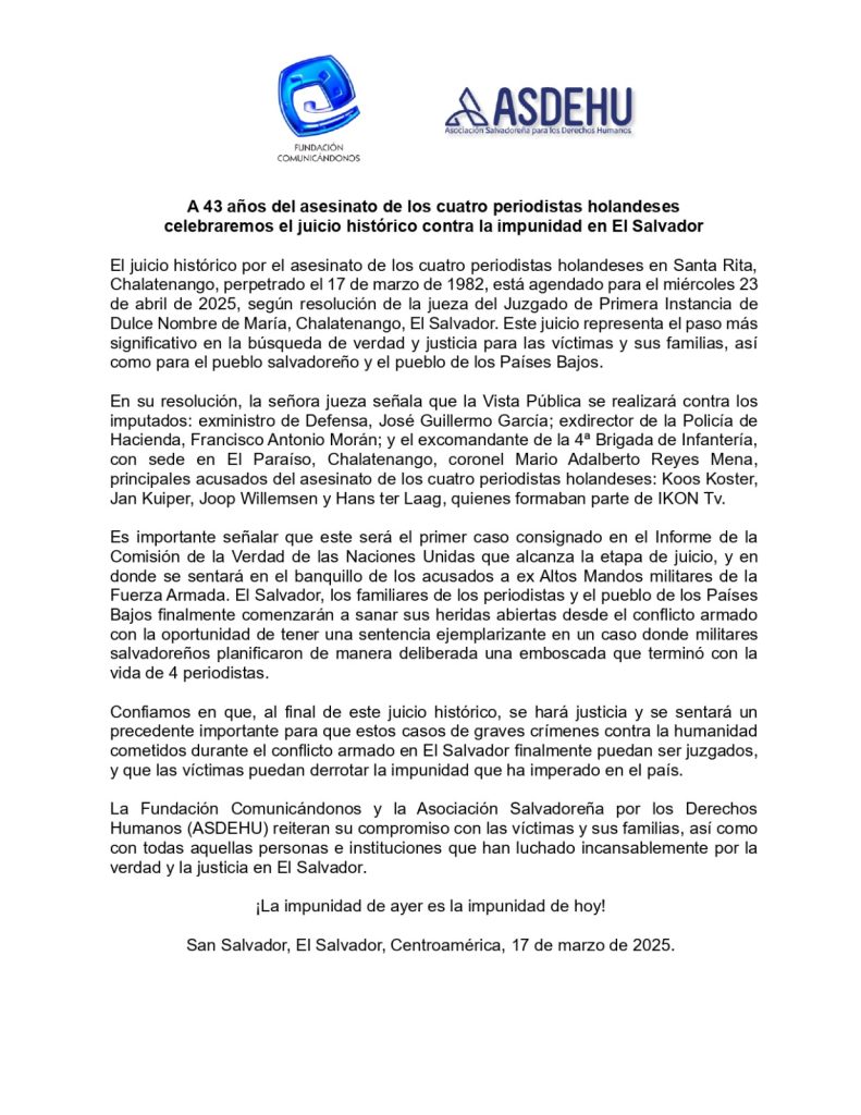 “Este juicio representa el paso más significativo en la búsqueda de verdad y justicia para las víctimas y sus familias, así como para el pueblo salvadoreño y el pueblo de los Países Bajos”, sostuvieron la Fundación Comunicándonos y la Asociación Salvadoreña para los Derechos Humanos (ASDEHU).