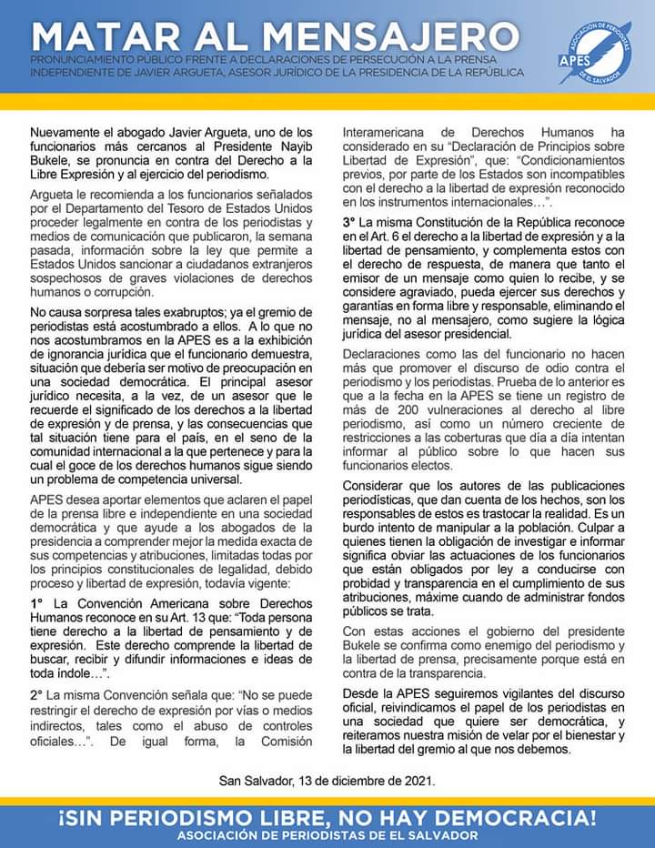 Frente a esta situación, la Asociación de Periodistas de El Salvador (APES), emitió un comunicado de prensa expresando su postura frente a dichas declaraciones y rechazando, por completo, cualquier argumento recomendativo por parte de Argueta.