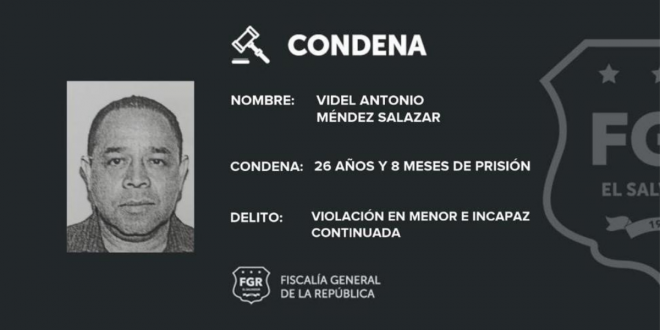 El Tribunal Primero de Sentencia de Sonsonate condenó a 26 años y ocho meses de prisión al profesor Videl Antonio Méndez Salazar por el delito de violación sexual en menor incapaz en modalidad continuada, en perjuicio de su exalumna Juliana Prado (nombre ficticio), a quien agredió durante seis años.