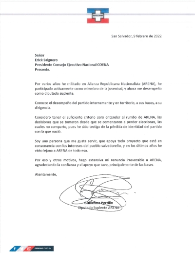 En una carta dirigida a Erick Salguero, presidente del Consejo Ejecutivo Nacional de Arena (Coena), Portillo manifestó que renuncia por no compartir las decisiones de la dirigencia.