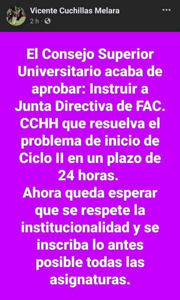 En este marco, el profesor del Departamento de Periodismo de la UES y miembro del Consejo Superior Universitario (CSU), Vicente Cuchillas, declaró en su cuenta de Facebook que el CSU aprobó instruir a la Junta Directiva de la Facultad de Ciencias y Humanidades resolver esta problemática en un plazo de 24 horas.