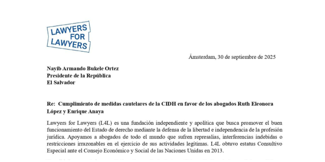 Lawyers for Lawyers (L4L), una fundación internacional independiente que trabaja por la defensa de la abogacía libre, urgió al Estado salvadoreño el cumplimiento inmediato y efectivo de las medidas cautelares dictadas recientemente en favor de los abogados Ruth López y Enrique Anaya.