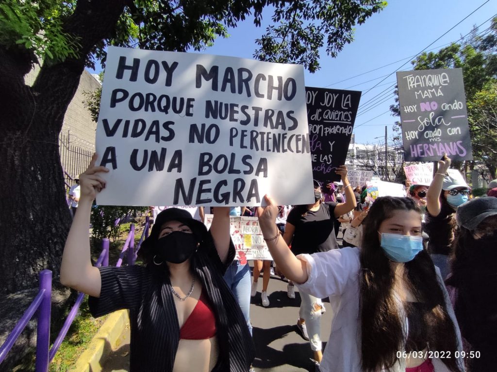 «Las niñas no se tocan, no se violan, ni se matan», fue una de las consignas que elevaron las mujeres, quienes también lanzaron duras críticas al gobierno del presidente Nayib Bukele.