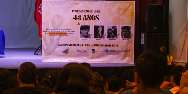 Durante el cinefórum, organizado por Fundación Comunicándonos, la Asociación Salvadoreña para los Derechos Humanos, la UES, el Colectivo de Académicos del Departamento de Periodismo de la UES, la Mesa Contra la Impunidad y VOCES, se proyectó el documental «A Sangre Fría», de la productora neerlandesa «Zembla», que retrata la historia de los cuatro periodistas holandeses y los presuntos responsables del crimen; entre estos, el coronel Mario Reyes Mena, quien reside en Estados Unidos.