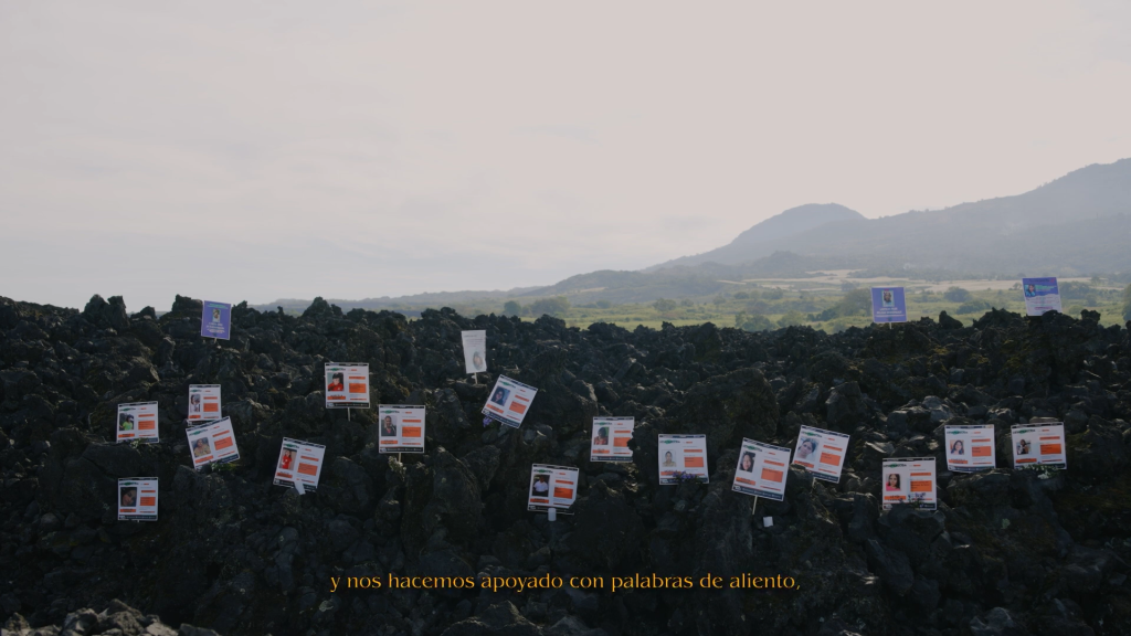 “A Beatriz le escuché decir que ‘buscaría hasta por debajo de las piedras’, y al estar entre tanta piedra volcánica no podía dejar de verla a ella y a las demás madres. Por eso como respuesta pusimos las fotos de todos y todas las desaparecidas saliendo de entre las piedras como un gesto de esperanza de encontrarles en algún futuro cercano”, afirmó Novoa.