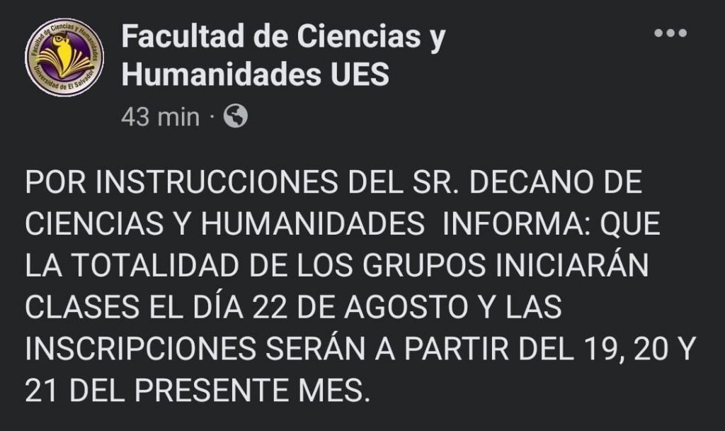 El profesor del Departamento de Periodismo de la Universidad de El Salvador (UES) y miembro del Consejo Superior Universitario (CSU), Vicente Cuchillas, declaró en su cuenta de Facebook que las clases de la Facultad de Ciencias y Humanidades iniciaran el próximo 22 de agosto.